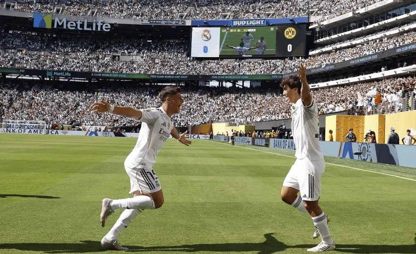上赛季欧冠决赛中技高一筹的皇马以2-0战胜对手,捧起第15座欧冠联赛冠军奖杯。本次再遇多特蒙德,皇马开场10分钟由21岁小将贡萨洛-加西亚头球破门,20分钟弗兰-加西亚助攻破门扩大比分领先。