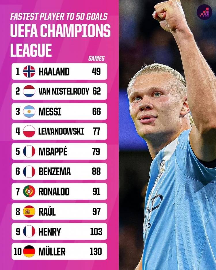 这场比赛的进球让哈兰德的个人欧冠进球达到50球。这让他创造了新历史。他是欧冠50球最快达成球员。他只用了49场,超越了梅西、姆巴佩和C罗这些超级球星。梅西欧冠打进50球用了66场比赛,姆巴佩则用了79场,至于C罗,他用了91场。对比之下,可见哈兰德的进球效率有多高,在欧冠的射门质量有多高。哈兰德现在只有25岁,只要保持健康状态,他在未来还会打破很多历史纪录。